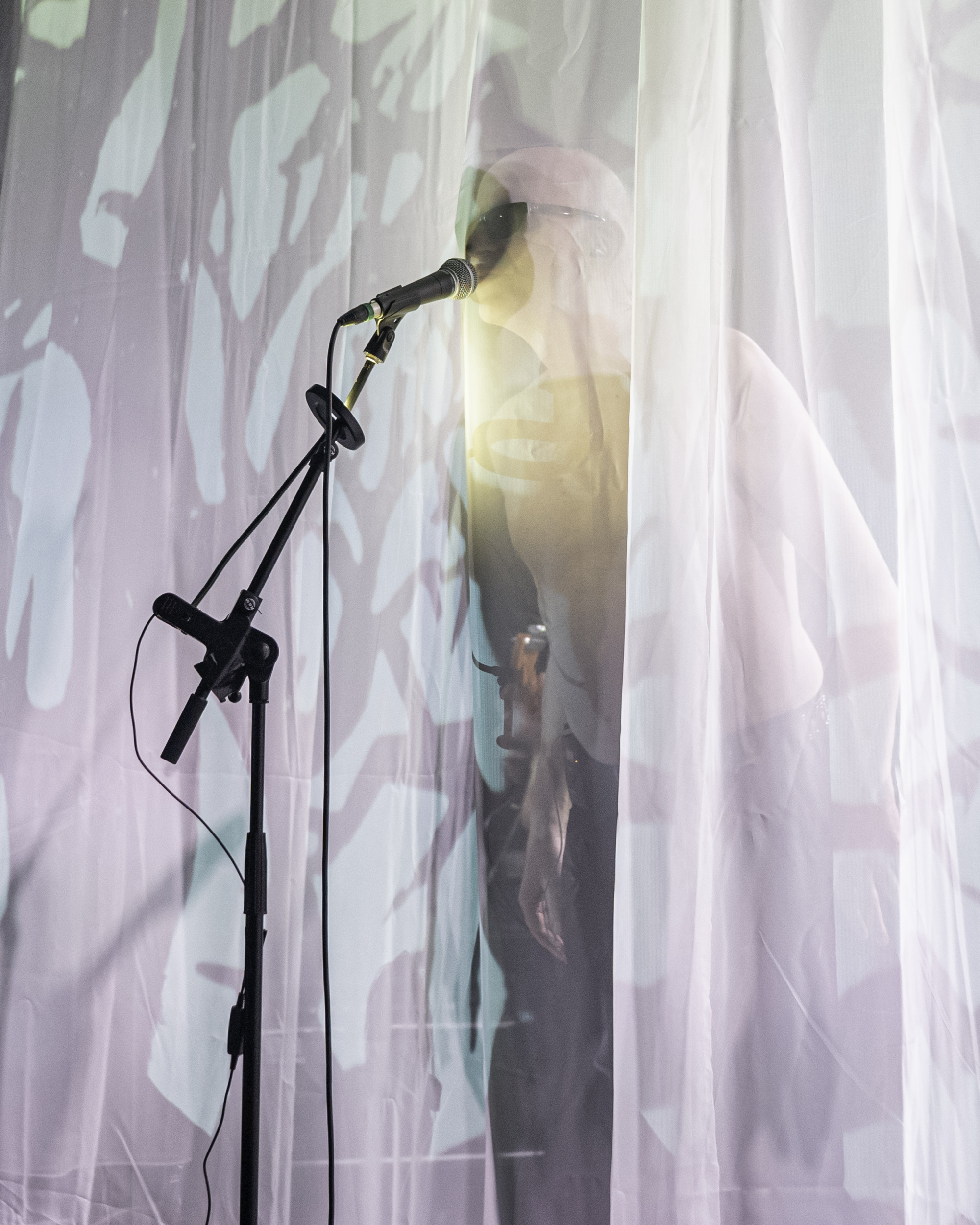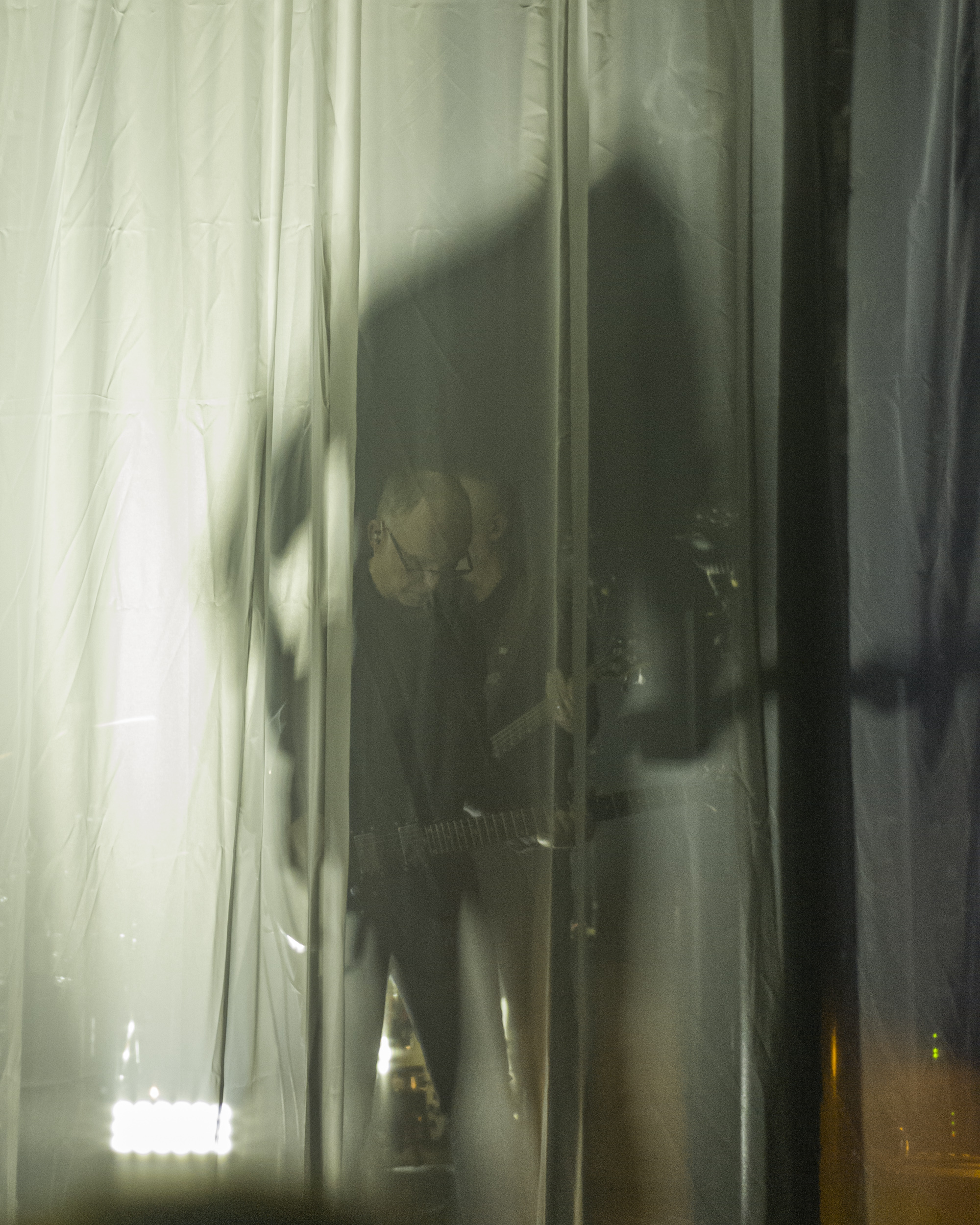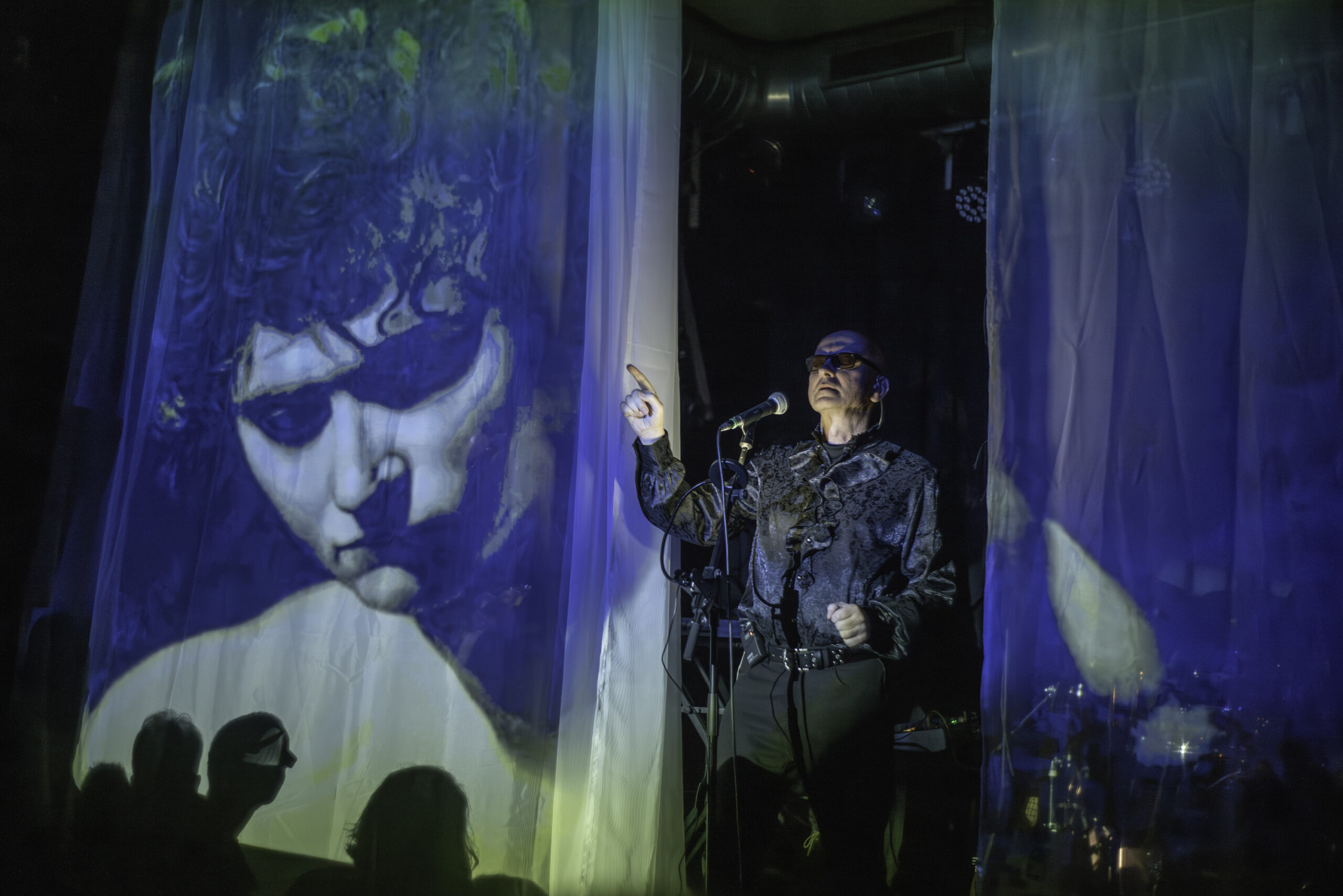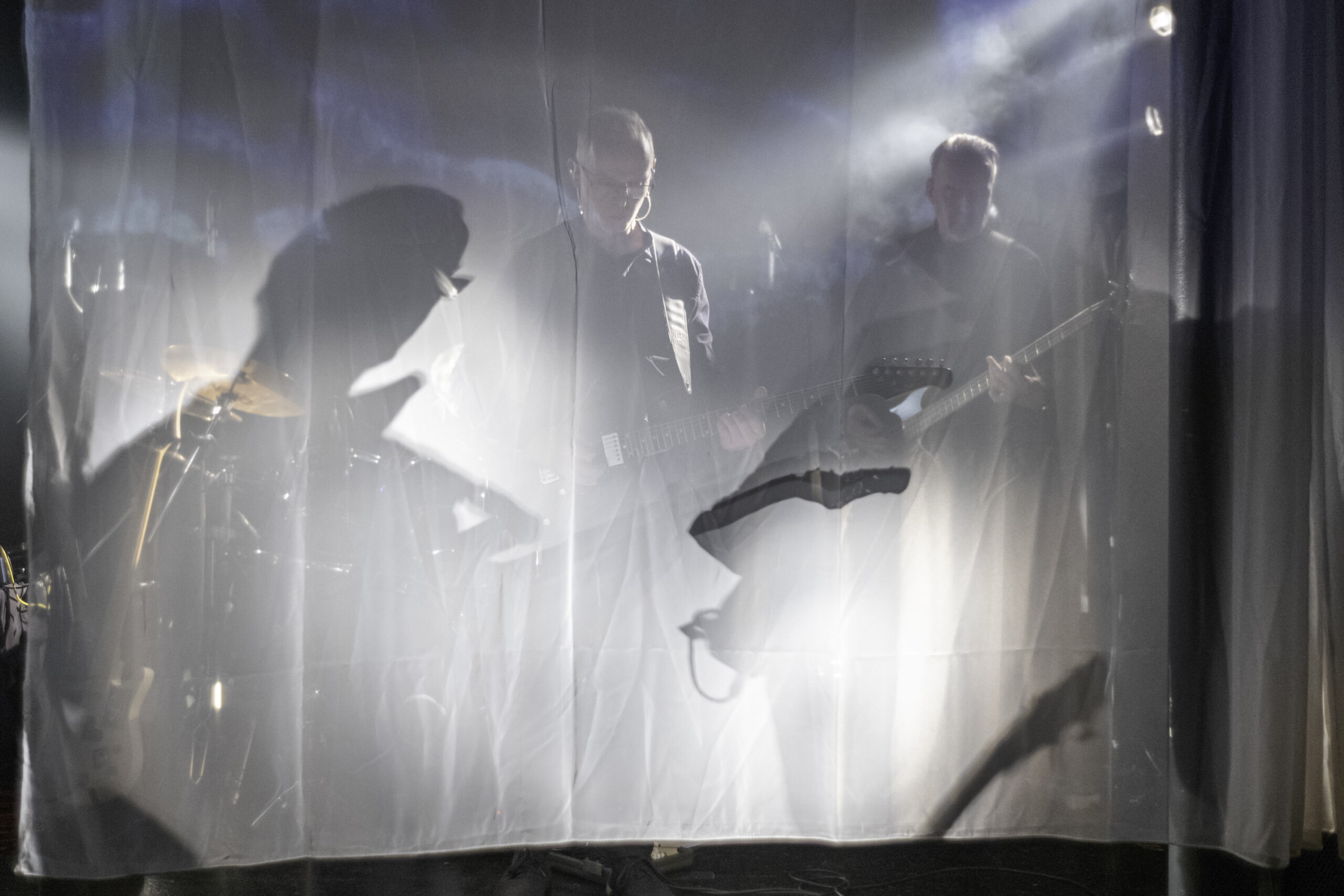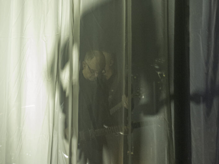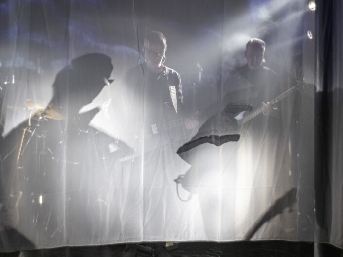 Als jemand der das Konzert in Leipzig erlebt hat, war für mich der Moment der Überraschung über die Dramaturgie, die Fülle an altem und neuem Material, die Frische und den Druck, mit denen die Performance auf der Bühne passierte, nicht ganz so groß. Hätte ich gedacht. Aber es hat mich wieder geflasht. Auch weil der Rahmen in Salzwedel, im Club Hanseat, anders war, als im UT-Connewitz. Abgesehen von dem schon beschriebenen Heimataspekt. Der Hanseat ist um einiges kleiner, als das UT, das Publikum ist auf drei Ebenen verteilt, die Bühne fast ebenerdig und gerade so breit, dass die sechs Musiker genug Platz finden. Für diesen Abend gab es eine spezielle Dramaturgie zur Integration der visuellen Elemente – ein leichter, fast durchsichtiger Vorhang wurde bei Bedarf von den Seiten der Bühne zugezogen. Darauf wurden Bilder, Schrift oder Videos projiziert. Die Schatten der Musiker, deren durchscheinende Gestalten und der durch den Vorhang in das Mikrofon oder durch einen Spalt in der Mitte singende Helge Semlow waren bemerkenswerte Performance-Effekte bei diesem Auftritt.